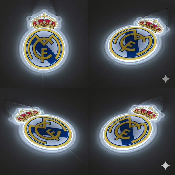 Escudo de futbol liga 1º division REAL MADRID, Diseño con medidas metacrilato 40x35cm aproximadamente dependiendo el diseño del escudo con neon led,metacrilato y vinilo color.Alimentacion 12v,cable 2m y cadena para colgar en pared incluido.
