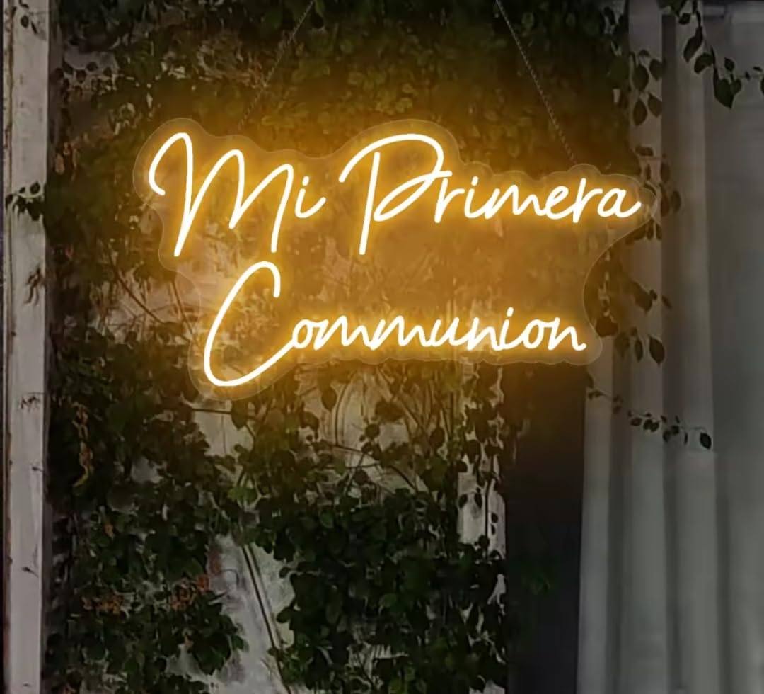 - DISEÑO PERSONALIZADO: Letrero de neón LED con texto 'Mi Primera Communion' en elegante caligrafía cursiva y luz cálida dorada