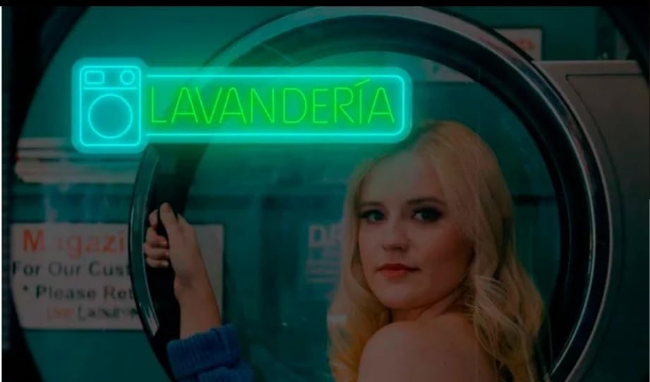 - ILUMINACIÓN DUAL: Combina dos tonos de luz LED neón, azul turquesa para el ícono de lavadora y verde brillante para el texto 'LAVANDERIA'
