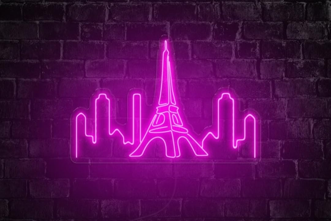 - ESTILO URBANO: Representación artística del horizonte parisino que combina elementos modernos de neón con la clásica silueta de la ciudad