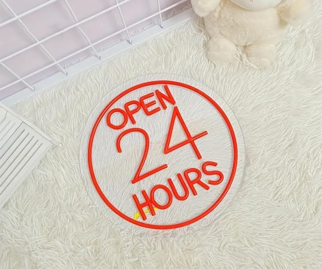 - DISEÑO LLAMATIVO: Letrero de neón LED con texto 'OPEN 24 HOURS' en color blanco brillante sobre fondo rojo intenso