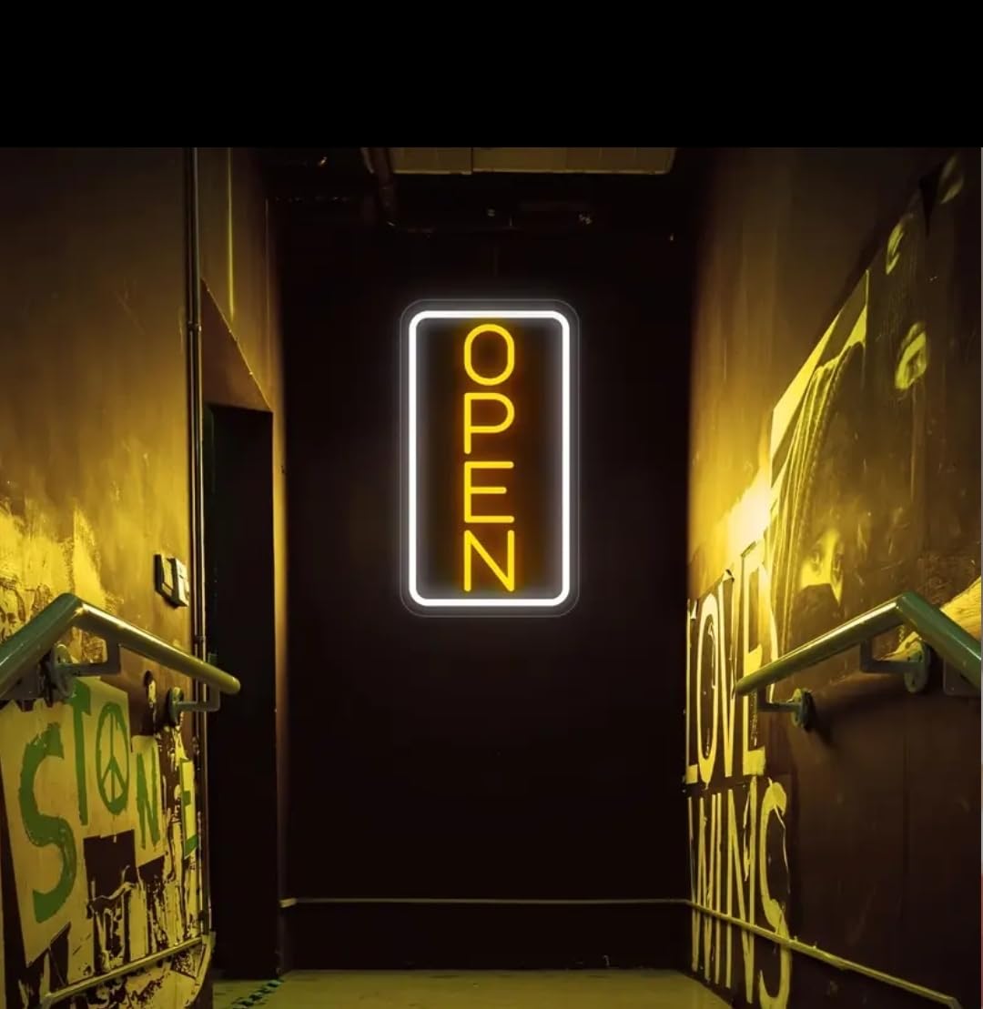Letrero Luminoso Abierto de Neón, 20 x 41 cm, Luz Comercial para Pared, Amarillo/Blanco
